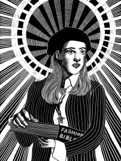 4×9″ scratchboard with digital color. From original drawing of an ornamented saint seen while backpacking across Eastern Europe.